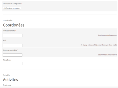 Dans l'ordre de mon formulaire c'est coordonnées, activité, horaire, pathologie, âges des patients pris en charge, types de prises en charge, tarification consultation et site internet. Dans ces rubriques il y par exemple pour les coordonées "titre de la fiche", "mail", "adresse", "tel"
